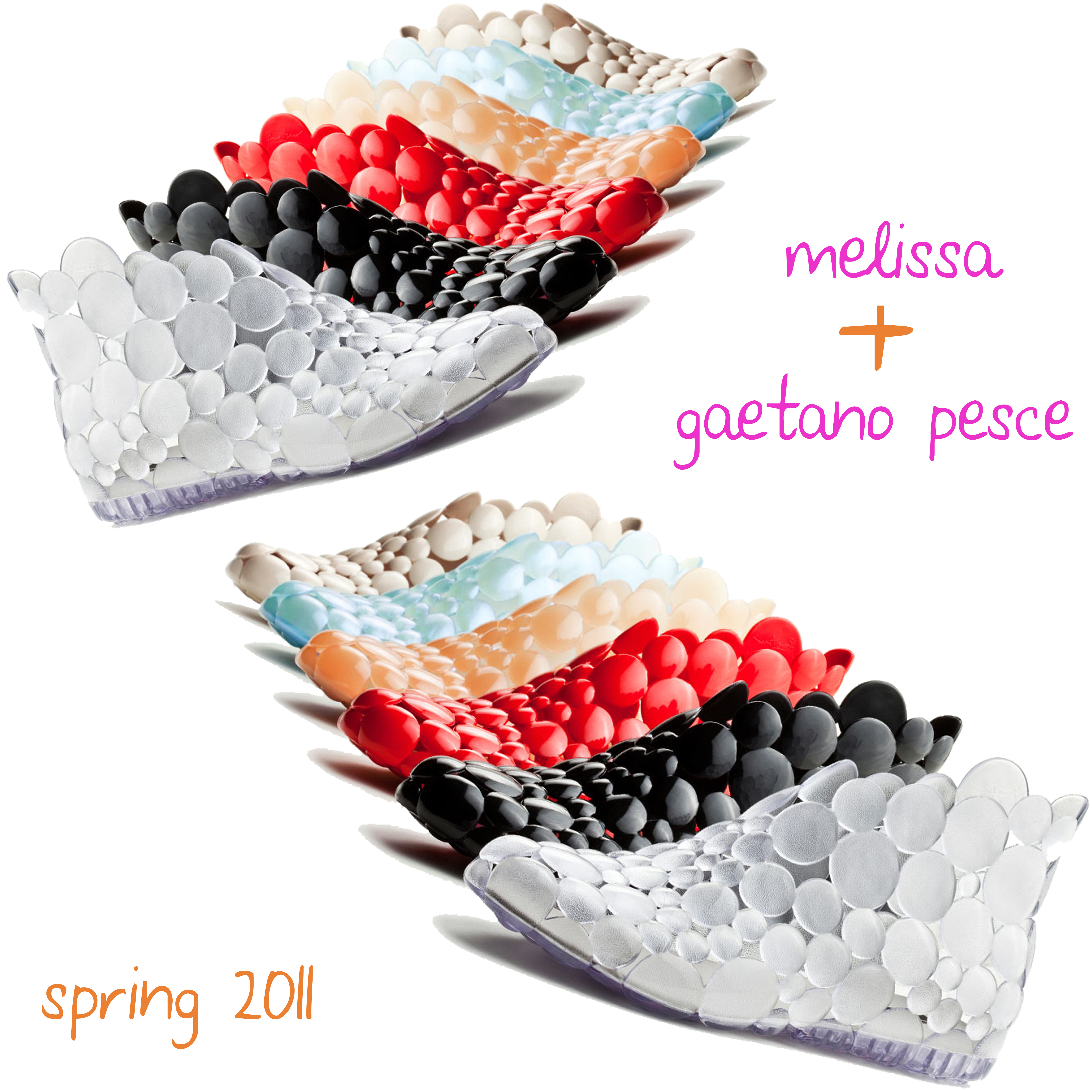 Melissa, brand brasiliano famoso per le originali calzature in plastica concepite con partner di tutto rispetto tra i quali Vivienne Westwood, Zaha Hadid, Karim Rashid, Jean-Paul Gaultier, arricchisce la propria collezione con la sorprendente visione di Gaetano Pesce: una struttura lenticolare che nasce come “stivaletto” ma capace di trasformarsi in differenti modelli, grazie al proprio gusto ed un semplice paio di forbici. Sono un’ alternativa alle ballerine di plastica, disponibili in sei colori, una nota spiritosa e colorata per un look femminile e pop.