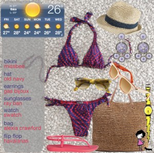 The bikini is one of new missbee’s collection http://missbee.it/index.php and found it in milan at verger http://www.verger.it/ bikini are reminiscent of Brazil and his colors , well worn and material they are made is sooo soft … We decided to propose it with astraw hat, borsalino as a model, colored sunglasses, earrings gas bijoux, the swatch limited edition designed by Jeremy Scott and havaians as a flip-flop …