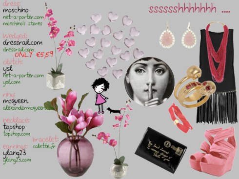 Ciao ragazze, ieri sera a milano avevo voglia di tempi passati… partendo da un abito di moschino con le frange vi proniamo un outfit che potrebbe ricordare gli anni ’20 ma con un tocco di modernità assoluta dato dagli accessori. Le zeppe le trovate a 5,59 euro su http://www.dressrail.com/ un sito che abbiamo scoperto da poco con abiti e accessori a prezzi molto interessanti. La collana è topshop e la trovate su http://www.topshop.com, l’anello è di alexander Mcqueen e lo trovate sul suo sito, su http://www.net-a-porter.com/ o nei negozi monomarca.Il braccialetto con il teschio lo trovate nel concept store parigino colette, o sul suo sito. La pochette è di ysl di qualche anno fa la trovate sul sito del brand o negli store.