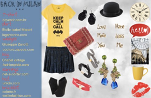Ciao ragzze! Per chi tra voi è tornata nelle proprie città, vi proponiamo un outfit cittadino, ma che non si prende troppo sul serio… Vi suggeriamo una gonna corta, svolazzante e frivola che mette in evidenza le gambe abbronzate appena tornate dalle vacanze, dei tronchetti, scarpa che non potrà mancare nel vostro guardaroba, oppure un paio di zeppe colorate ed altisssssime. Non dimenticate un cappello vero must have di della stagione fredda 2011-2012. Non risparmiate sugli accessori che sono i veri protagonisti di ogni vostro outfit… Se poi indossate una maglietta con su scritto ” KEEP CALM AND CALL BATMAN” vi potete concedere di tutto…