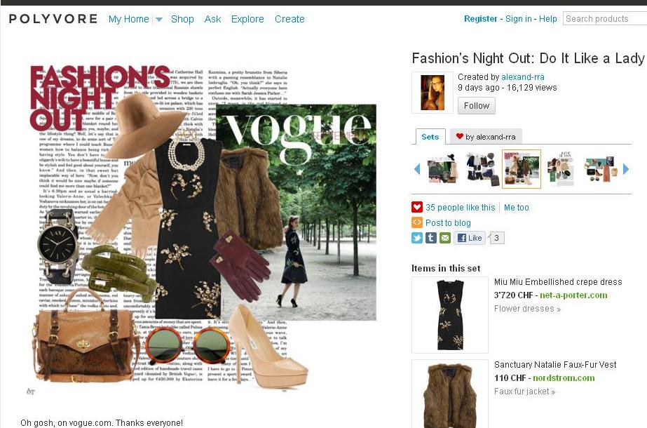 Hello boys and girls! There is a very nice contest on Polyvore: it is about creating a set with clothes designed specifically for the VOGUE FASHION NIGHT OUT and the best sets will be selected by 3 special judges : Blake Lively (Gossip Girl), Alexander Wang and Grace Coddington. Blake has already chosen the two sets she likes best. This week it is up to Alexander!