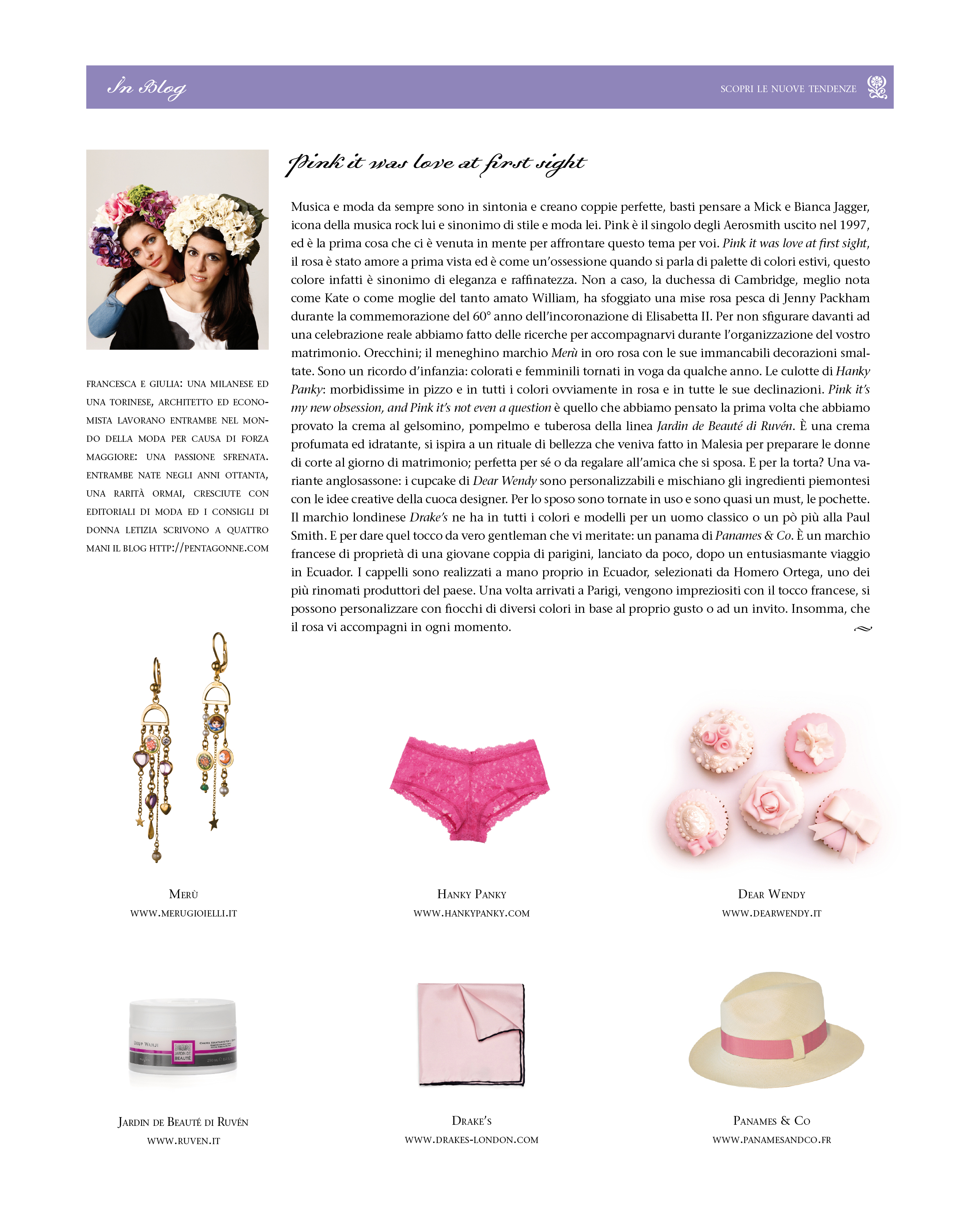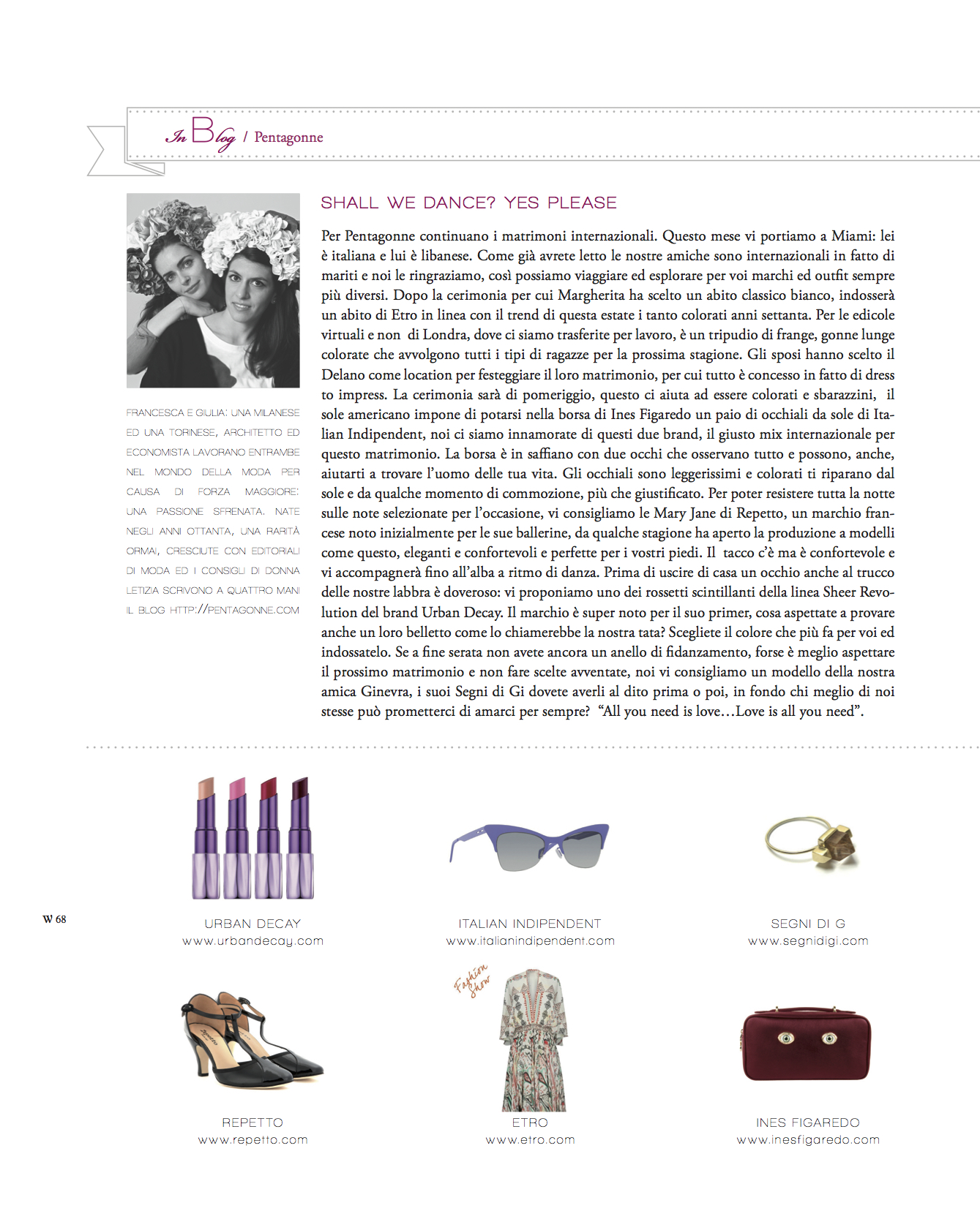 Per Pentagonne continuano i matrimoni internazionali. Questo mese vi portiamo a Miami: lei è italiana e lui è libanese. Come già avrete letto le nostre amiche sono internazionali in fatto di mariti e noi le ringraziamo, così possiamo viaggiare ed esplorare per voi marchi ed outfit sempre più diversi. Dopo la cerimonia per cui Margherita ha scelto un abito classico bianco, indosserà un abito di Etro in linea con il trend di questa estate i tanto colorati anni settanta. Per le edicole virtuali e non di Londra, dove ci siamo trasferite per lavoro, è un tripudio di frange, gonne lunge colorate che avvolgono tutti i tipi di ragazze per la prossima stagione. Gli sposi hanno scelto il Delano come location per festeggiare il loro matrimonio, per cui tutto è concesso in fatto di dress to impress. La cerimonia sarà di pomeriggio, questo ci aiuta ad essere colorati e sbarazzini, il sole americano impone di potarsi nella borsa di Ines Figaredo un paio di occhiali da sole di Italian Indipendent, noi ci siamo innamorate di questi due brand, il giusto mix internazionale per questo matrimonio. La borsa è in saffiano con due occhi che osservano tutto e possono, anche, aiutarti a trovare l’uomo delle tua vita. Gli occhiali sono leggerissimi e colorati ti riparano dal sole e da qualche momento di commozione, più che giustificato. Per poter resistere tutta la notte sulle note selezionate per l’occasione, vi consigliamo le Mary Jane di Repetto, un marchio francese noto inizialmente per le sue ballerine, da qualche stagione ha aperto la produzione a modelli come questo, eleganti e confortevoli e perfette per i vostri piedi. Il tacco c’è ma è confortevole e vi accompagnerà fino all’alba a ritmo di danza. Prima di uscire di casa un occhio anche al trucco delle nostre labbra è doveroso: vi proponiamo uno dei rossetti scintillanti della linea Sheer Revolution del brand Urban Decay. Il marchio è super noto per il suo primer, cosa aspettate a provare anche un loro belletto come lo chiamerebbe la nostra tata? Scegliete il colore che più fa per voi ed indossatelo. Se a fine serata non avete ancora un anello di fidanzamento, forse è meglio aspettare il prossimo matrimonio e non fare scelte avventate, noi vi consigliamo un modello della nostra amica Ginevra, i suoi Segni di Gi dovete averli al dito prima o poi, in fondo chi meglio di noi stesse può prometterci di amarci per sempre? “All you need is love…Love is all you need”.